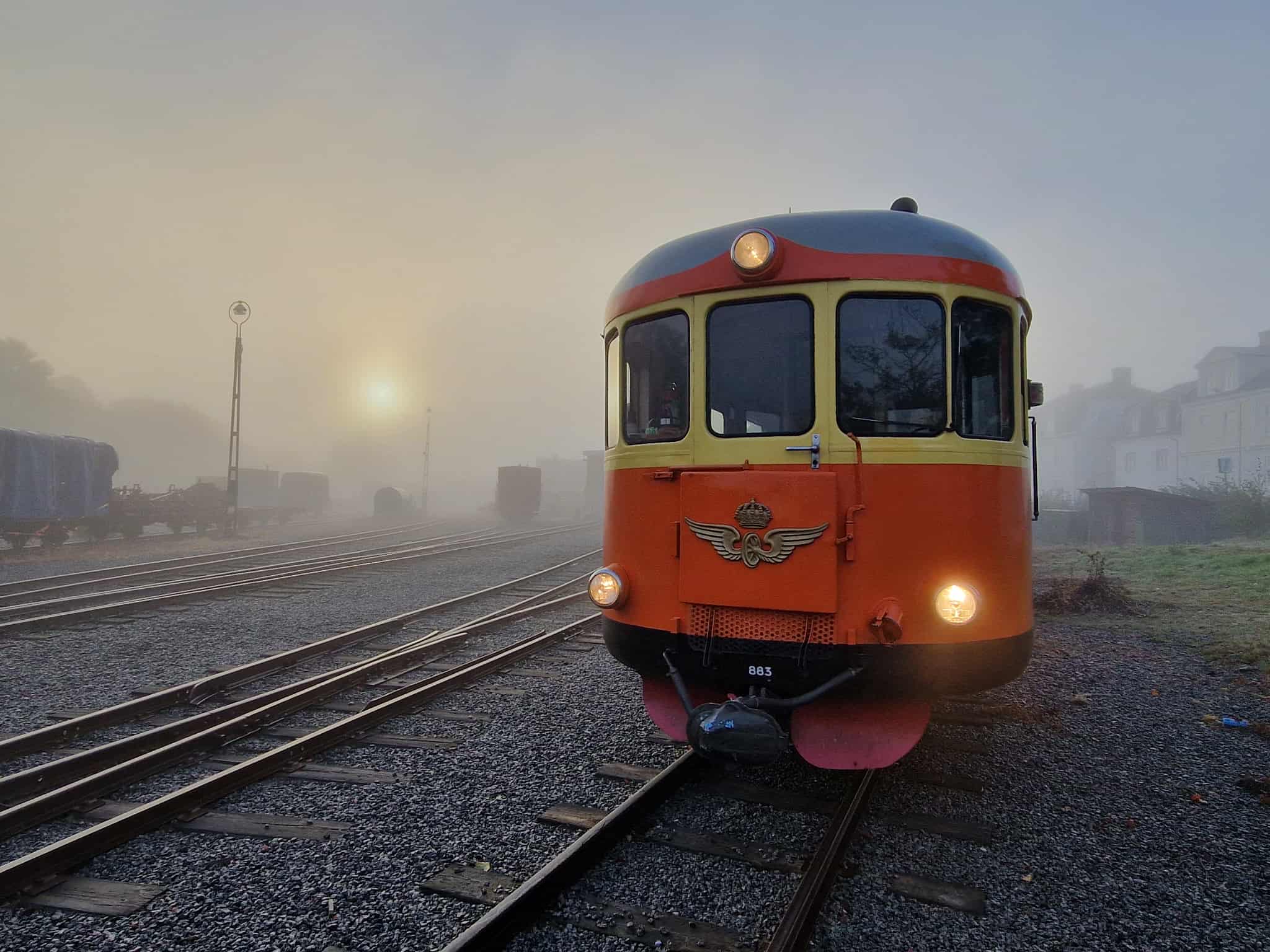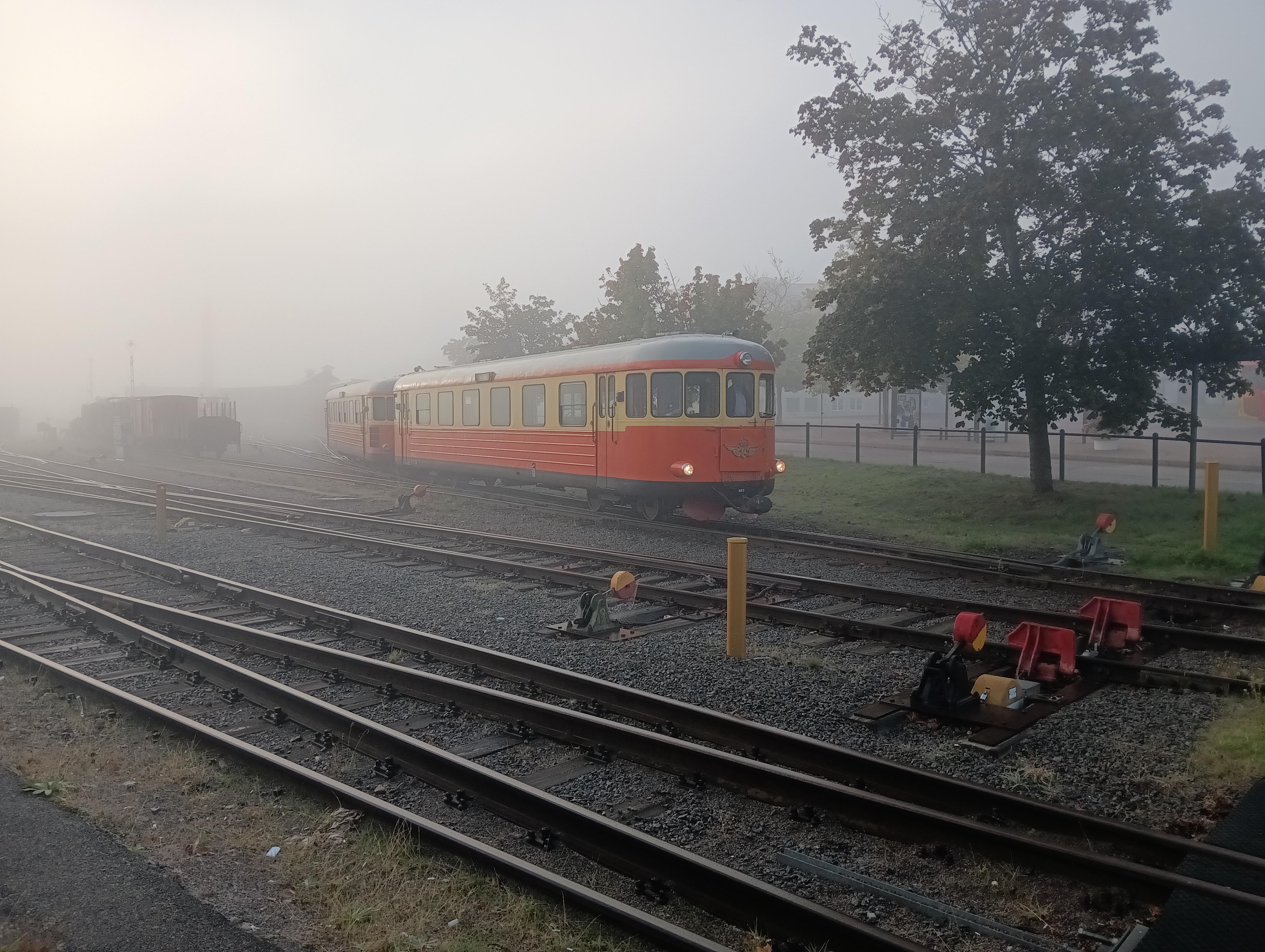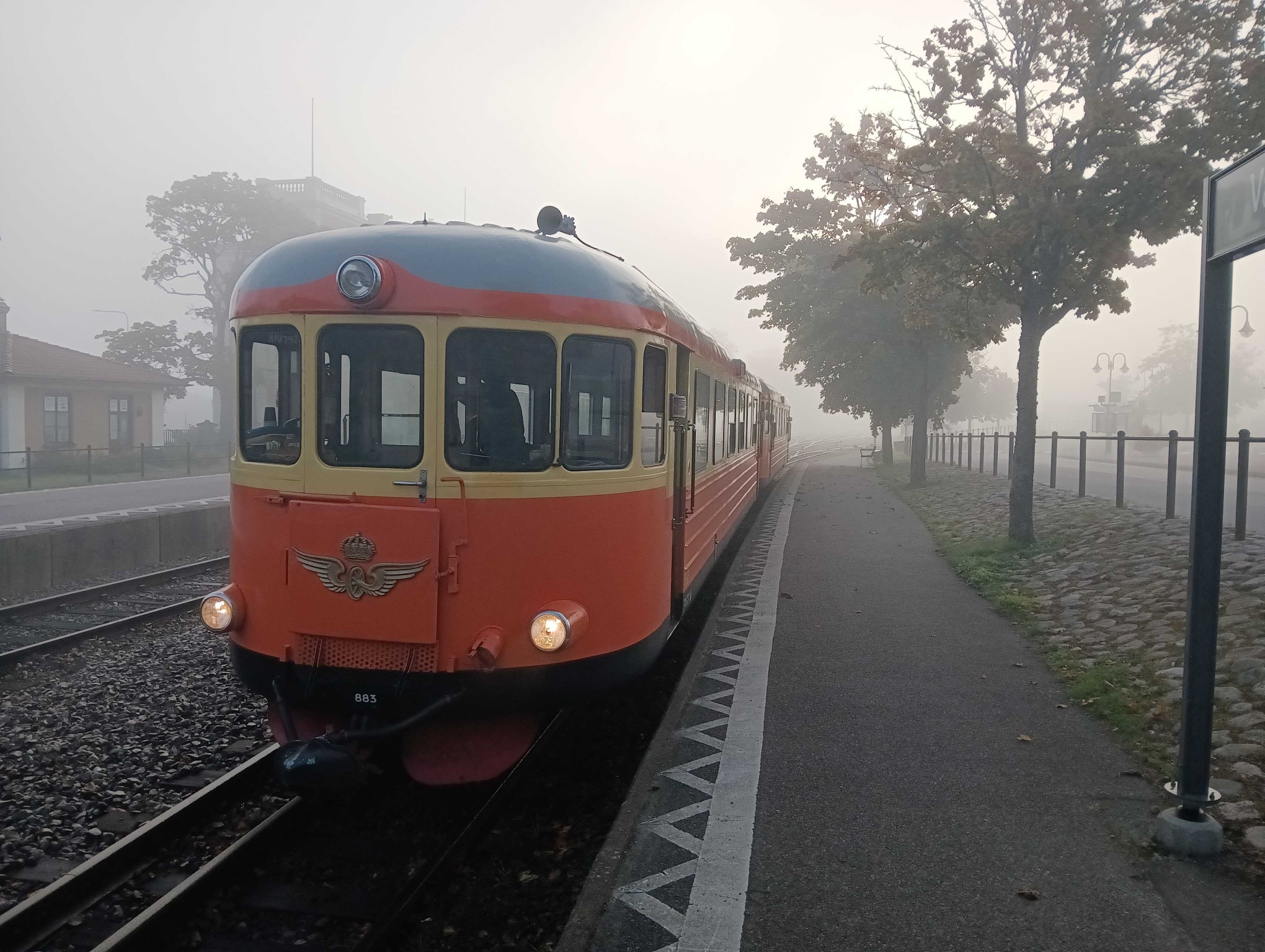 Rälsbussen YBo5p 883 har rullat ut ur motorvagnshallen i Västervik. Solen har varit uppe ett tag, men orkar inte riktigt bryta igenom morgondimman.