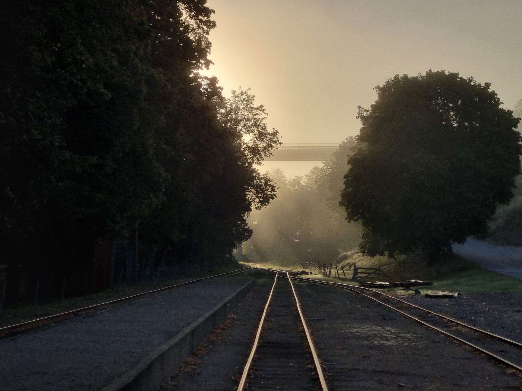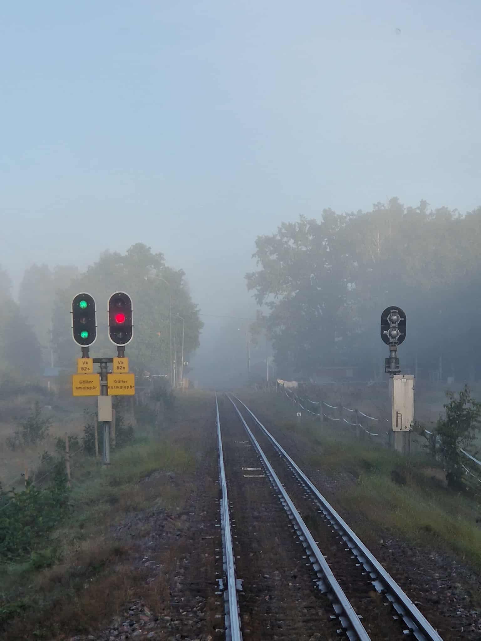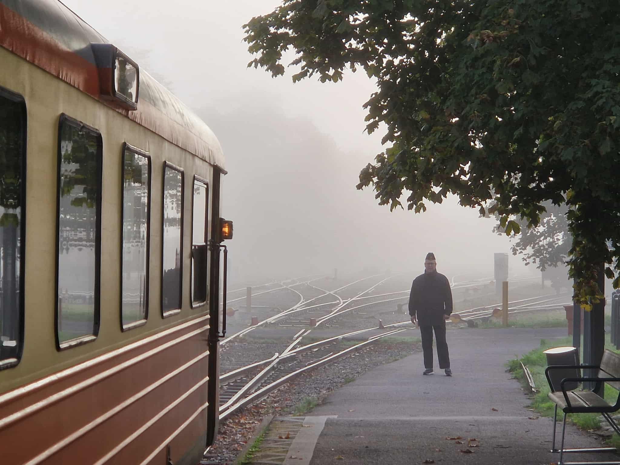 Dagens konduktör har precis lagt tillbaka spårspärren mot smalspårsbangården, dimman ligger ännu tät över stationsområdet.