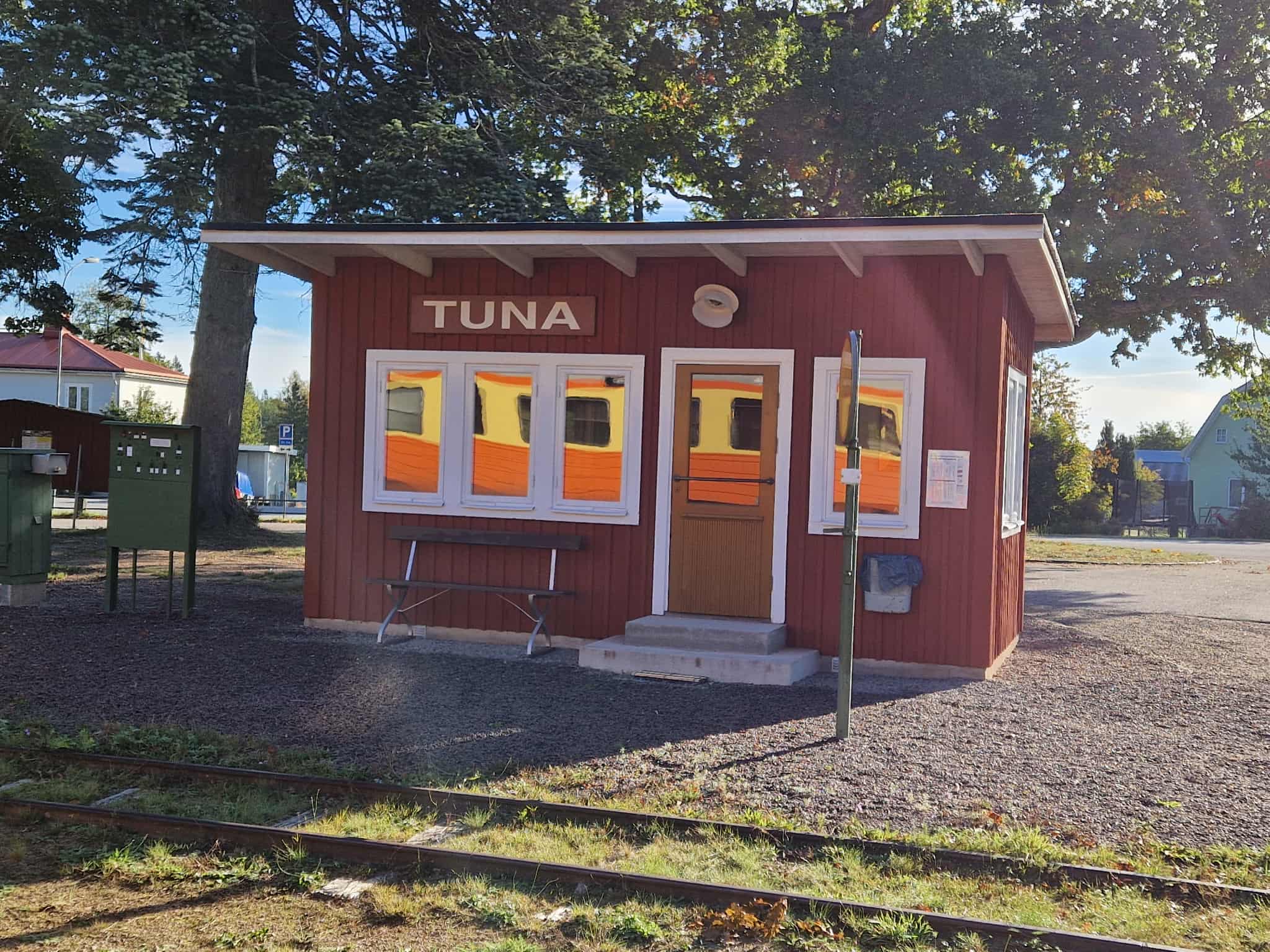 I Tuna har dimman släppt helt och rälsbussen speglar sig i fönstren på hållplatskuren.