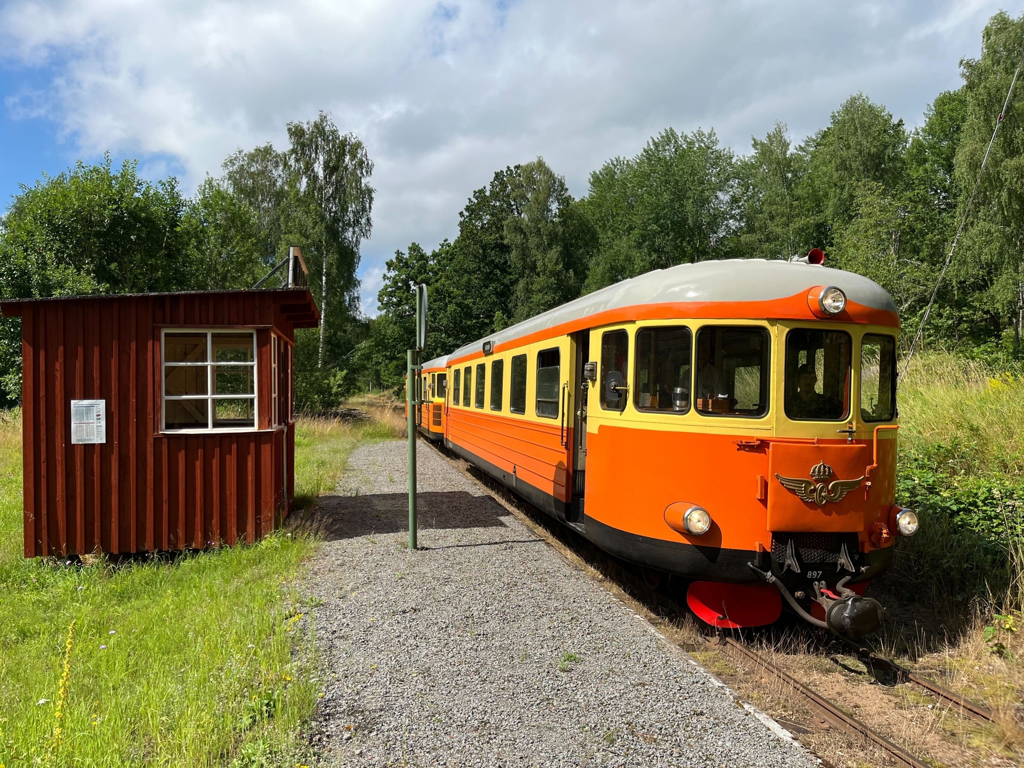 Så är vi inne i juli och den dagliga sommartrafiken rullar på. Resandet har i år varit bra, men det märks en tydlig förskjutning av resandet, då antalet resenärer i början på sommaren var något mindre än normalt, men i slutet av sommaren var det desto fler. Inför 2026 anpassar vi därför tidtabellen och lägger till ytterligare en högtrafikvecka i augusti. De gånger då två vagnar inte räckt till i tåget har släpvagnen UCFo3yp 1791 fått följa med i tåget. Här gör eftermiddagståget mot Hultsfred uppehåll för avstigande i Ankarsrum.