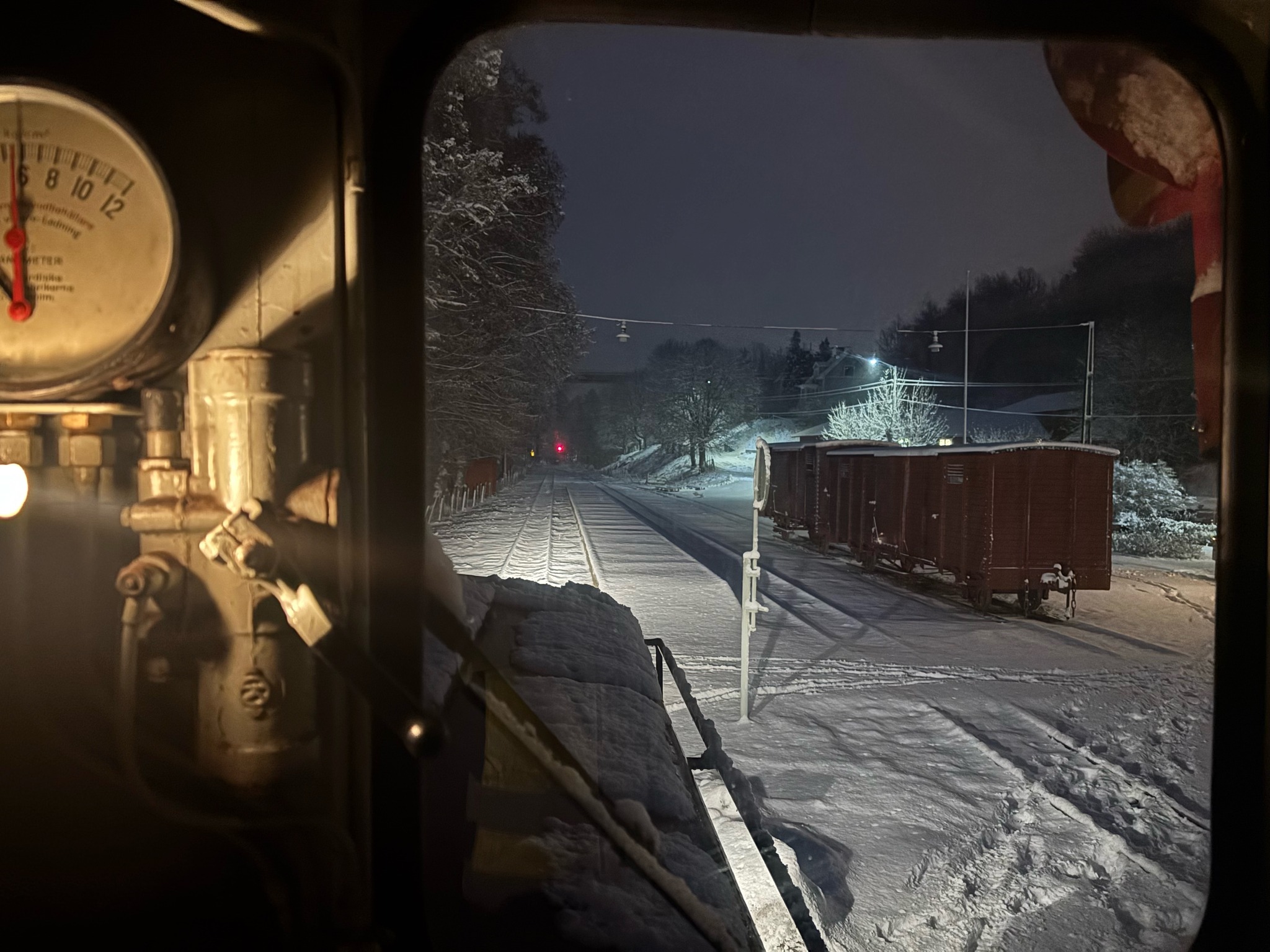 En stämningsbild från en lokomotorhytt i Verkebäck i november. Det har kommit ett snöfall och för att kunna köra julmarknads- och julbordståg till och från Ankarsrum och Fårhult behövde banan plogas.